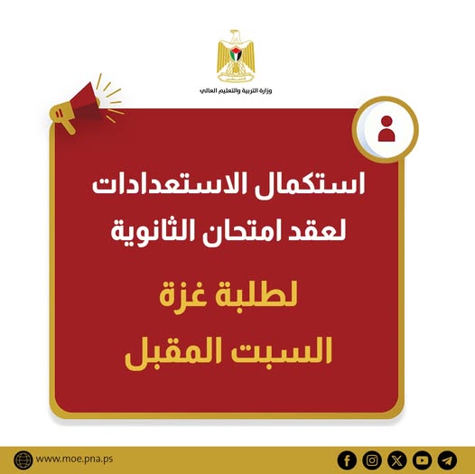 التربية: استكمال الاستعدادات لعقد امتحان الثانوية لطلبة غزة السبت المقبل