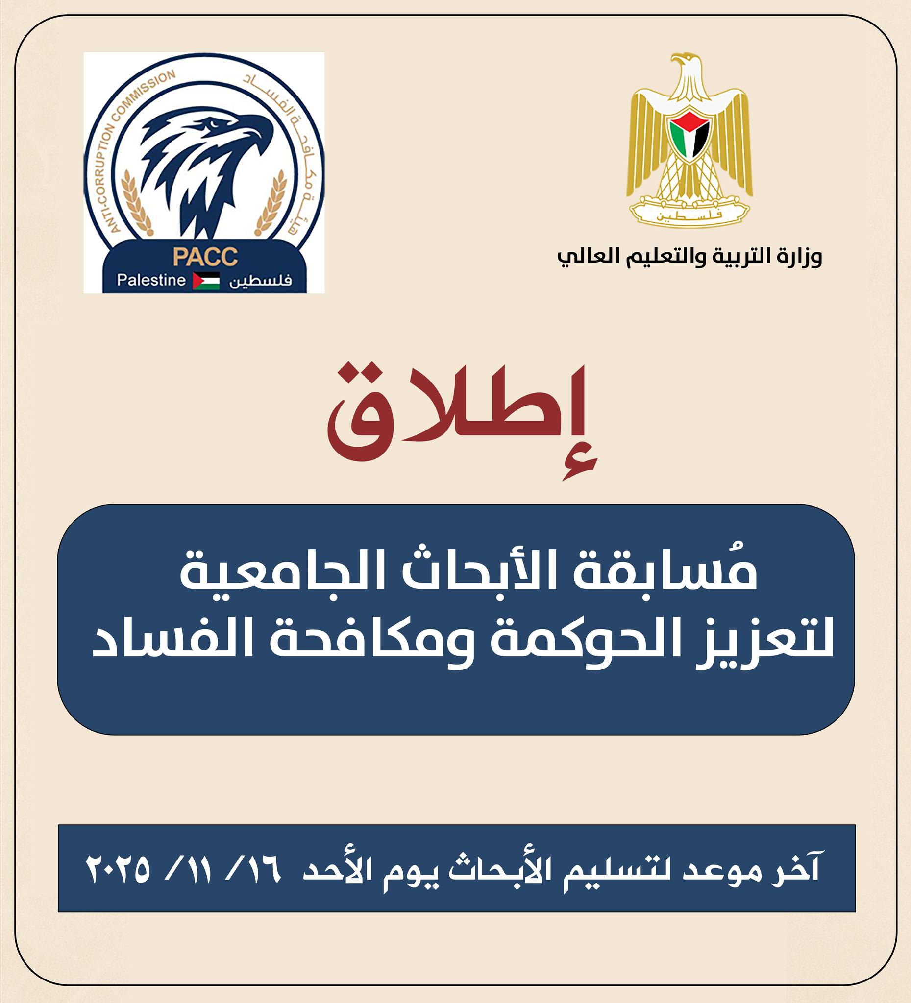 تهدف إلى تشجيع #الطلبة على البحث في موضوعات متعلقة بالنزاهة والشفافية ومُكافحة الفساد، وتطوير أفكارٍ جديدةٍ تُسهم في تعزيزِ مفهومِ الحوكمة في #المجتمع_الفلسطيني.