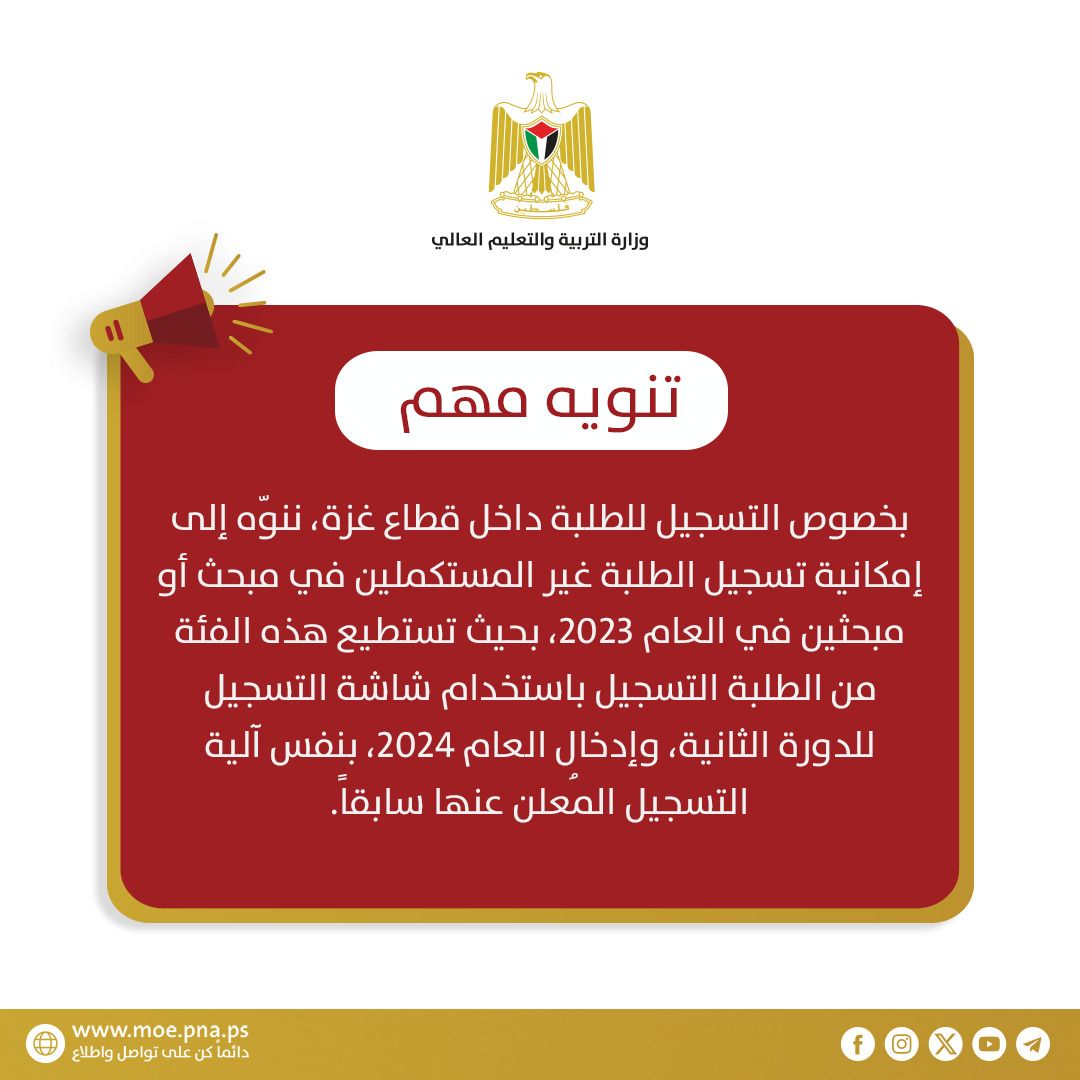 تنويه مهم لطلبة قطاع غزة المستكملين في مبحث أو مبحثين لعام 2023