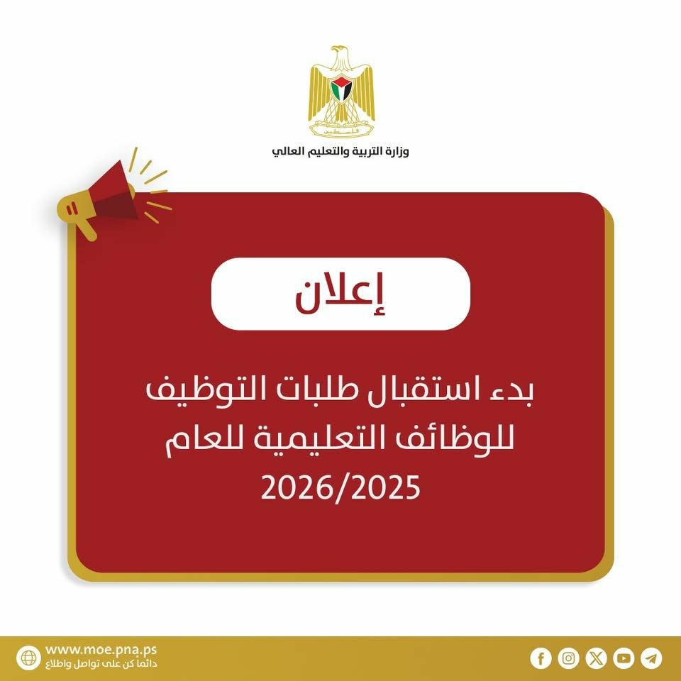أعلنت وزارة التربية والتعليم العالي بدء استقبال طلبات التوظيف للوظائف التعليمية والمساندة والمهنية للعام الدراسي 2026/2025، اعتبارا من اليوم الثلاثاء ولغاية يوم السبت 15/02/2025.