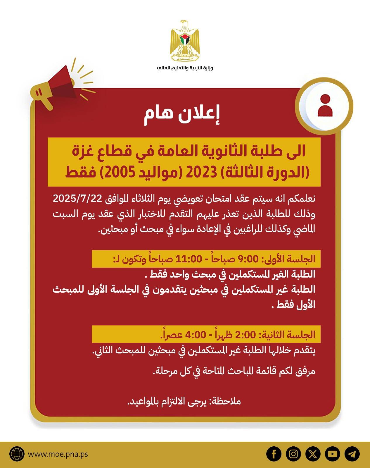 إعلان هام لطلبة الثانوية العامة في قطاع غزة – الدورة الثالثة 2023 (مواليد 2005 فقط)